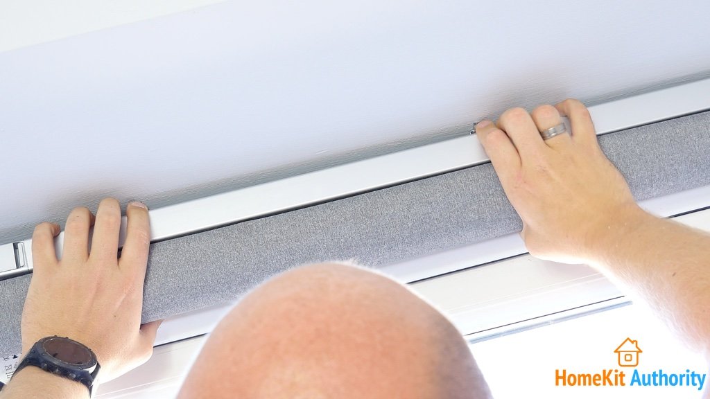 Once you fixed the mounting brackets in place, the next step is to mount the smart blind to the brackets. You do this by pressing a button on the brackets and pushing up. It’s that simple to get them installed.