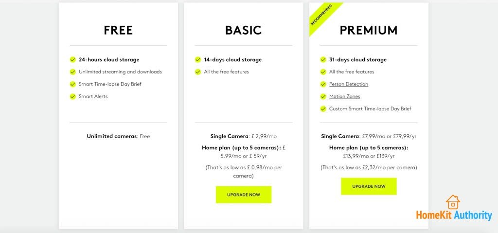Home plan (up to 5 cameras): £ 5,99/mo or £ 59/yr